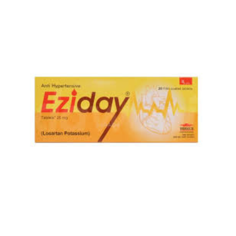 Losartan potassium blocks angiotensin II, a hormone that causes blood vessels to narrow and raises blood pressure. By preventing this binding, Eziday tablet helps the vessels relax, improving blood flow and lowering strain on the heart. Deficiency in blood pressure management can increase the risk of stroke, heart attack, or kidney damage. Losartan is preferred because it has a predictable effect on blood pressure and is generally well-tolerated.